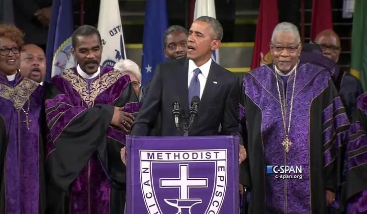Poco después, el político sorprendía a los allí presentes entonando los primeros acordes de la canción "Amazing Grace", un tema a menudo cantado en las iglesias afroamericanas. Nada más comenzar, los asistentes sonreían, aplaudían y se levantaban de sus asientos para unirse al presidente en el emotivo momento que conmovió a la multitud.