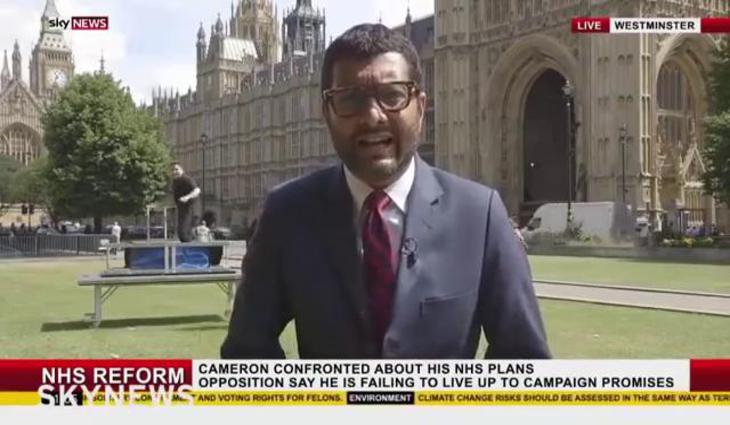 Dos jóvenes realizan un truco de magia durante la conexión en directo con un reportero de la cadena Sky News en directo con el informativo en pleno centro de Londres.