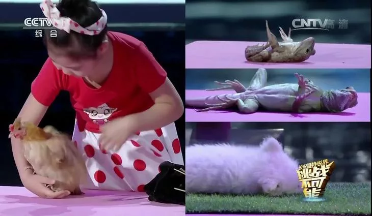 El talent show 'Al filo de lo imposible' del canal CCTV 1 muestra a una niña que a pesar de su corta edad logra con su voz y gestos hipnotizar a los animales para hacerlos reaccionar minutos después.