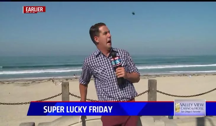 Brad Wills de la cadena FOX en San Diego no pudo contener su cara de pánico cuando fue atacado por un gran insecto en directo durante una conexión.