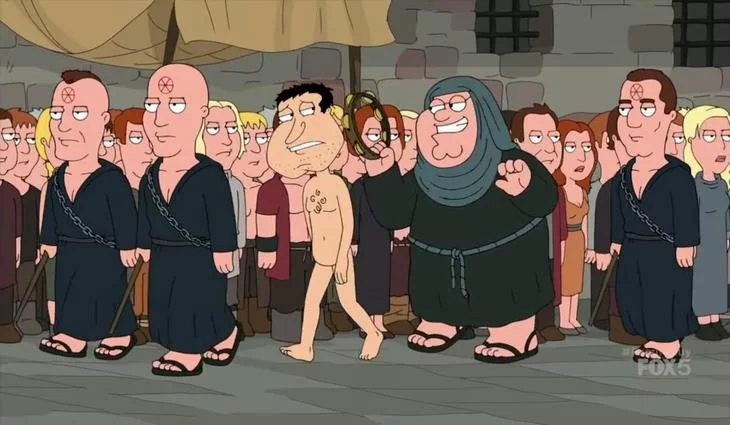 El trascendental momento de la serie de HBO ha sido parodiado por 'Family Guy' con Quagmire como protagonista mientras Peter le canta el famoso 'Shame, shame, shame' de Shirley & Co.