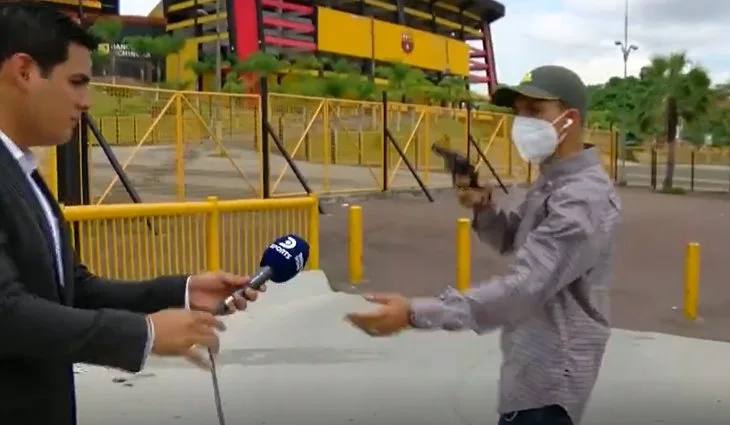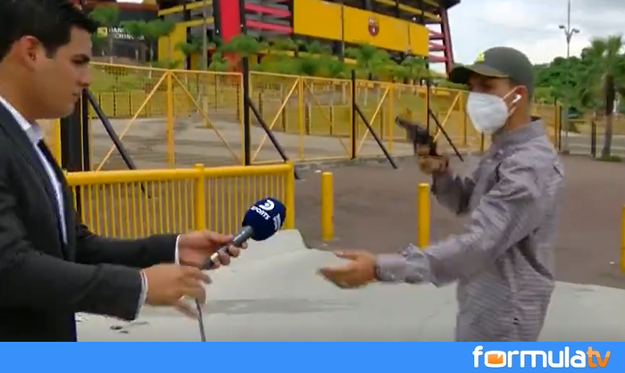 Impactante vídeo que compartió un reportero de DIRECTV Sports en Ecuador, quien fue asaltado a punta de pistola mientras trabajaba frente al Estadio Monumental. Diego Ordinola publicó las imágenes para denunciar la inseguridad que sintió a plena luz del día mientras trabajaba. El presentador ecuatoriano mostró en sus redes sociales el atraco que vivió el 12 de febrero, que fue completamente grabado y se hizo viral en Internet: "Ni siquiera podemos trabajar tranquilo. Esto ocurrió a las 13:00 de hoy en las afueras del Estadio Monumental", publicó Ordinola.