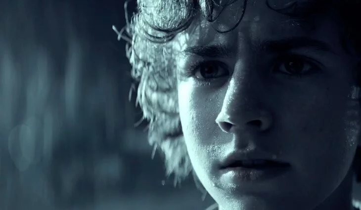 "Escucha, yo no quería ser mestizo. Ser mestizo es peligroso. Da miedo. Muchas veces hace que te maten. Si crees que puedes ser uno de nosotros, te aconsejo que huyas mientras puedas. Créete las mentiras que te contaron tus padres sobre tu nacimiento. Intenta llevar una vida normal. Porque en cuanto seas consciente de lo que eres, ellos lo notarán. Y vendrán a por ti. No digas que no te lo advertí", dice una voz en off mientras el muchacho protagonista se adentra en un edificio con aspecto de templo griego. Por último, un primerísimo primer plano muestra a Walker Scobell, quien interpreta a Percy Jackson, en medio de una tormenta.