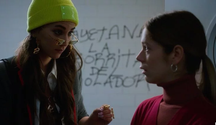 Las cosas no acabaron bien para el personaje de Phillippe (Pol Granch), pues salió a la luz que habría abusado sexualmente de una chica. Ahora, todo el colegio sabe lo que ocurrió y ha aparecido una pintada en la que se lee "Cayetana, la zorrita del violador". Rebeka es la que ha visto eso escrito tras colarse en Las Encinas por el vestuario de chicos. Por ello, llama a su amiga Caye para que vea lo que ha sucedido. Es cuando empieza una conversación muy sincera entre las dos amigas para afrontar la situación.