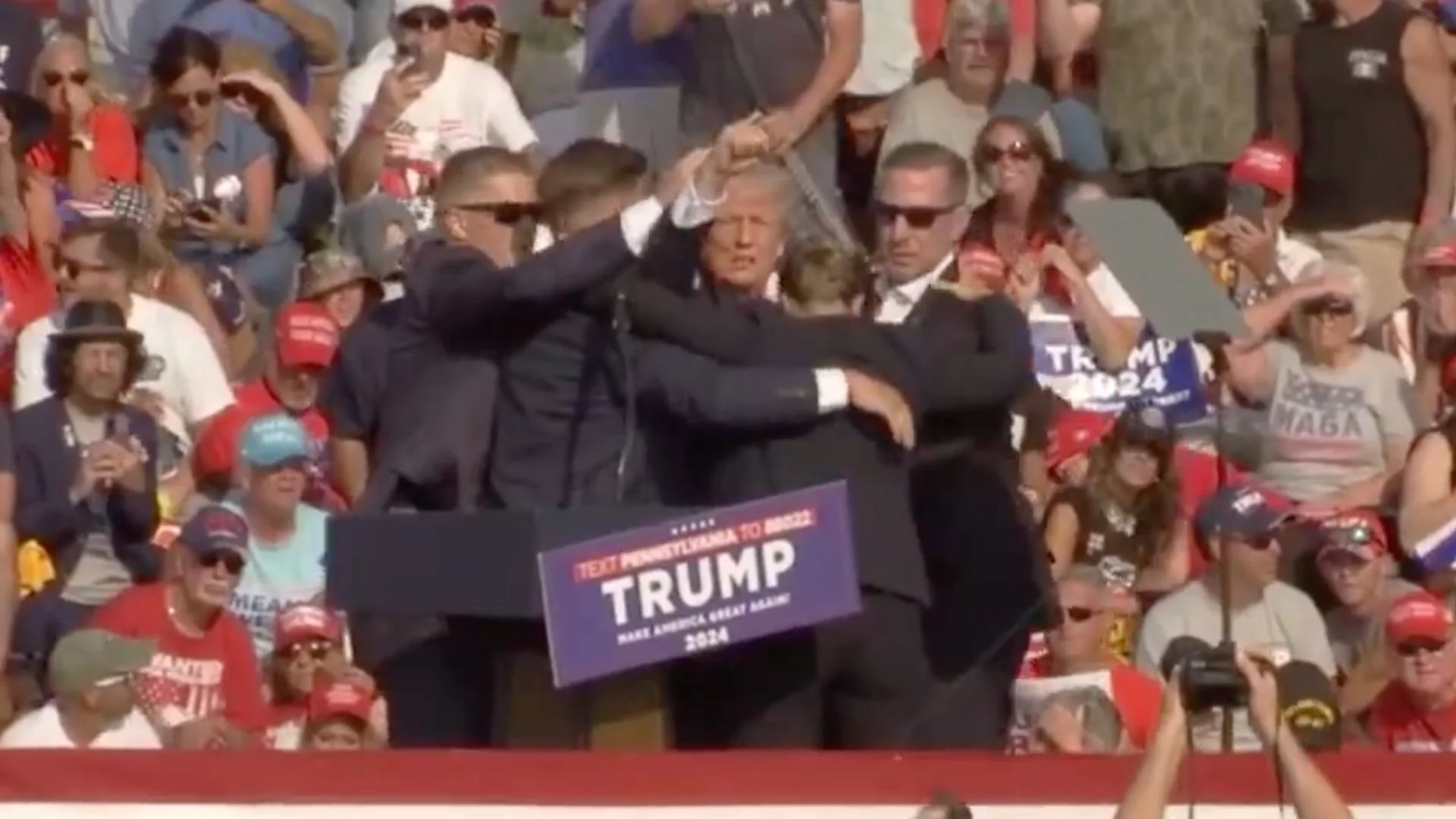 El candidato del Partido Republicano estadounidense se encontraba en pleno discurso rodeado de sus seguidores, que lucían pancartas de "Joe Biden estás despedido". Trump se ha llevado la mano a la oreja al recibir el disparo y se ha agachado a la espera de que sus guardaespaldas se abalanzasen sobre él para cubrirlo, desatando gritos de pánico entre el público. Una vez se ha recompuesto ha alzado el puño mientras lo escoltaban logrando la ovación de sus seguidores.