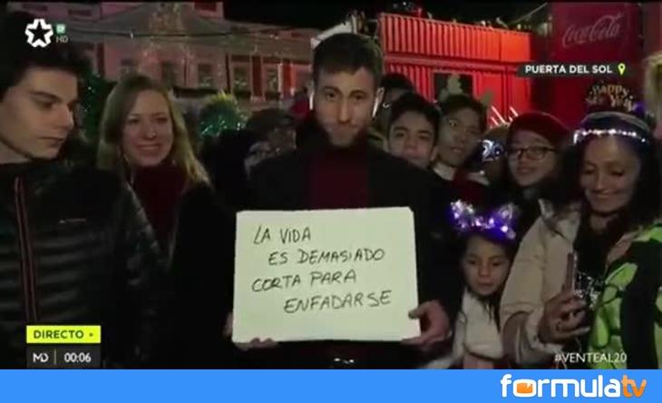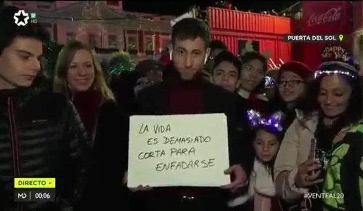 Rodeado de gente que celebraba el cambio de año y acompañado con la canción "Qué bonito es querer" de Manuel Carrasco, Muñoz ha ido mostrando una serie de carteles donde se podía leer lo siguiente: "Sed generosos con los que tienen menos que vosotros. Acordaos de quiénes no están hoy y de los que no estarán mañana. La vida es demasiado corta para enfadarse. Comparte, ama, sonríe. Hazlo siempre que puedas (no solo esta noche). Seamos mejores. ¡Feliz 2020!".