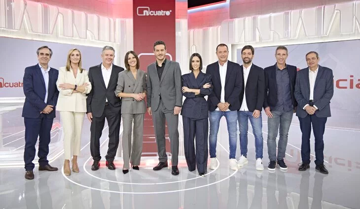 Todos ellos se pondrán ante las cámaras en un espacio de 300 metros cuadrados, dominado por los colores de la cadena, rojo y blanco, donde se pueden apreciar dos espacios diferenciados: el destinado a la información de actualidad de 'Noticias Cuatro' y el de los deportes, de 'El desmarque'. Las paredes están cubiertas por tres grandes pantallas horizontales de última generación, como parte de un plató con un centro único en España: una cuarta pantalla en forma de "L", desde el suelo hasta el techo.