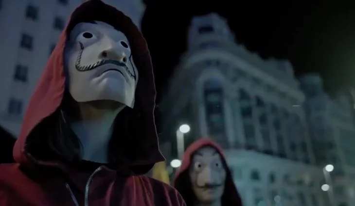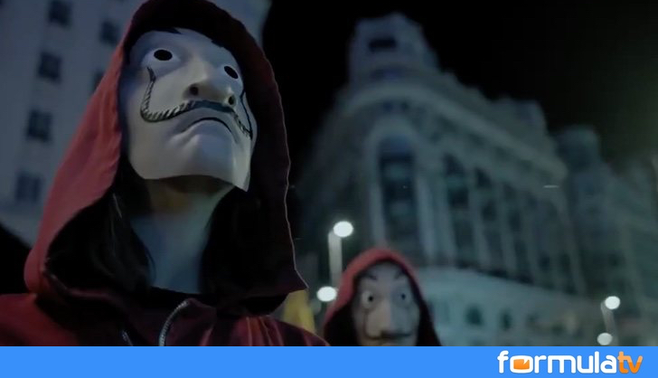 Con el anuncio de la fusión de Netflix y Movistar+, parece que la banda de 'La Casa de Papel' ha decidido atracar también el edificio de Telefónica. De hecho, eso es lo que hemos podido ver en la nueva promoción que junta a ambas plataformas. Dos Dalís, a punto de entrar en la mítica estructura de Madrid, se encuentran con una proyección de la característica máscara de la serie.
